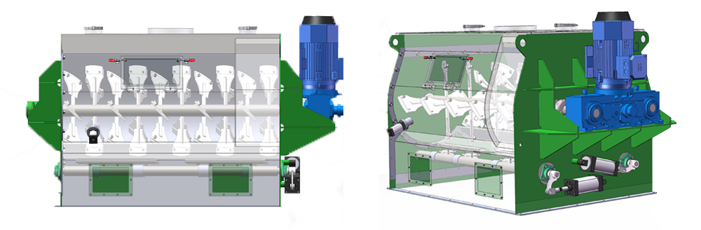 4-10m³雙軸無重力混合機由臥式筒體、傳動機構(gòu)、雙軸攪拌槳葉組成;工作時,雙軸相對反向旋轉(zhuǎn)帶動不同角度的槳葉將物料沿軸向、徑向循環(huán)翻動,在高線速度的作用下物料被拋起處于失重(即無重力)狀態(tài)后落下,拋起和落下時物料交叉混合達(dá)到均勻。出料口分為大開門式,出料快捷無殘留。本機的優(yōu)點是適用范圍廣、混合均勻度高、混合時間短。