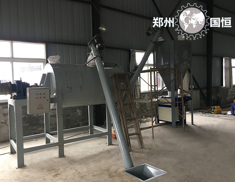 該機(jī)是我公司在各地生產(chǎn)的U型臥式多螺帶混合機(jī)的基礎(chǔ)上多次改進(jìn)而成,采用三層連續(xù)式螺條設(shè)計。該機(jī)通過攪拌軸的高速旋轉(zhuǎn),使內(nèi)外螺旋帶在較大范圍內(nèi)翻動物料,內(nèi)螺旋帶將物料向兩側(cè)運(yùn)動,外螺旋帶將物料由兩側(cè)向內(nèi)運(yùn)動,使物料來回混合,同時部分物料在螺旋帶推動下,沿軸向徑向運(yùn)動,從而形成對流混合,通過上述運(yùn)動,物料在較短時間內(nèi)獲得快速均勻混合。